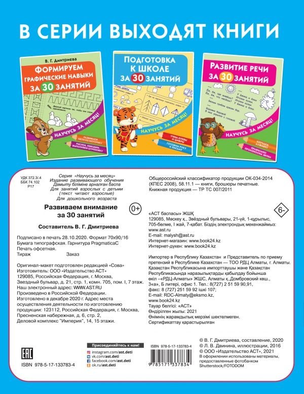 В пособии «Развиваем внимание за 30 занятий» — ни одной скучной страницы! Будущий первоклассник научится решать логические задачки, сравнивать, сопоставлять, анализировать, классифицировать, указывать на сходства и различия между картинками, подмечать детали, находить в предметах малозаметные, но существенные особенности, рассуждать последовательно и делать выводы. Материал изложен в простой, доступной форме и строится по принципу «Одна страница — одно занятие». Игровые задания тренируют наблюдательность, логику, развивают речь, внимание, память, креативное мышление и мелкую моторику.