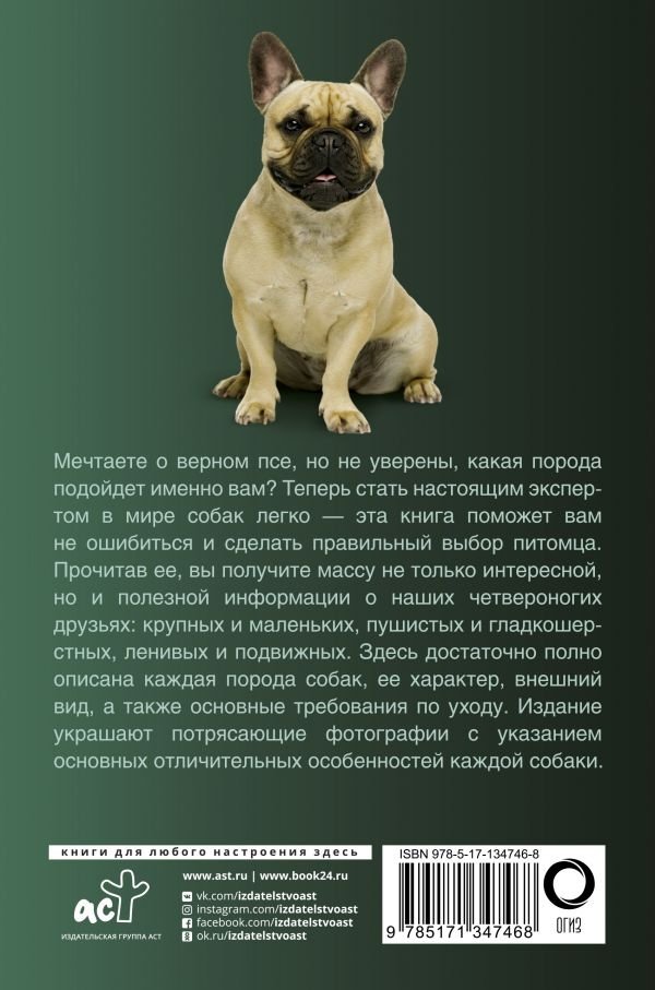 Собака, большая она или маленькая, — это член семьи, преданный друг и самый настоящий психотерапевт, который своей самоотверженной любовью помогает преодолевать нам стрессы современной жизни. Мечтаете о верном друге, но не уверены, какая порода подойдёт вам лучше всего? Теперь стать настоящим экспертом в мире собак легко — эта книга-гид поможет вам не ошибиться и сделать правильный выбор питомца, а также узнать массу интересных и полезных факторов о них: крупных и маленьких, пушистых и гладкошерстных, ленивых и подвижных. В ней наиболее полно раскрыта вся информация о видах собак и их характере, внешнем виде и основных требованиях по уходу и здоровью породы. Издание дополняет потрясающие фотографии с указанием основных отличительных черт каждой собаки.