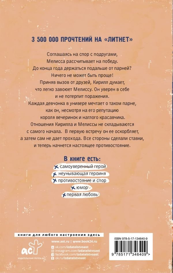 Приняв вызов от друзей, Кирилл думает, что легко завоюет Мелиссу. Он уверен в себе и не потерпит поражения. Каждая девчонка в универе мечтает о таком парне, как он, несмотря на его репутацию короля вечеринок и наглого красавчика.