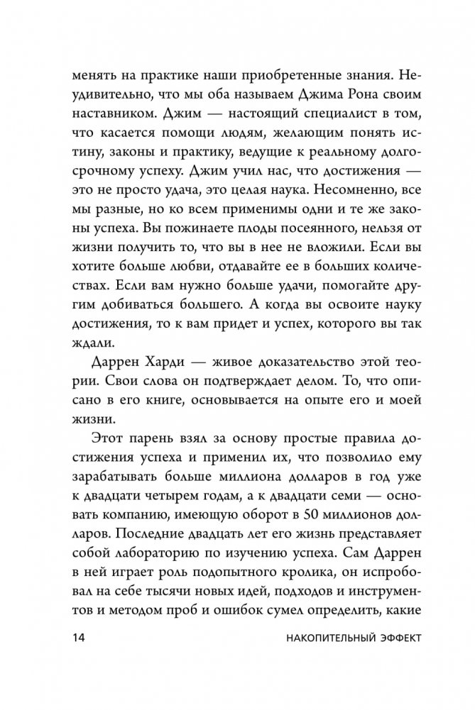 "Накопительный эффект" - легендарная книга, которую на Западе давно окрестили "библией по саморазвитию" и "лабораторией по изучению успеха". Впервые издается на русском языке. Признана бестселлером таких престижных книжных рейтингов как The New York Times и Wall Street Journal. Маленькими шагами к большим целям – именно в этом заключается смысл накопительного эффекта. Сформулировал его миллионер, предприниматель и лайф-коуч Даррен Харди. Свой первый миллион он заработал в 24 года, а в 27 его компания имела оборот в 50 миллионов долларов. В книге автор приводит 6 стратегий успеха, но напоминает, что секретным ингредиентом к каждой из них является именно накопительный эффект.