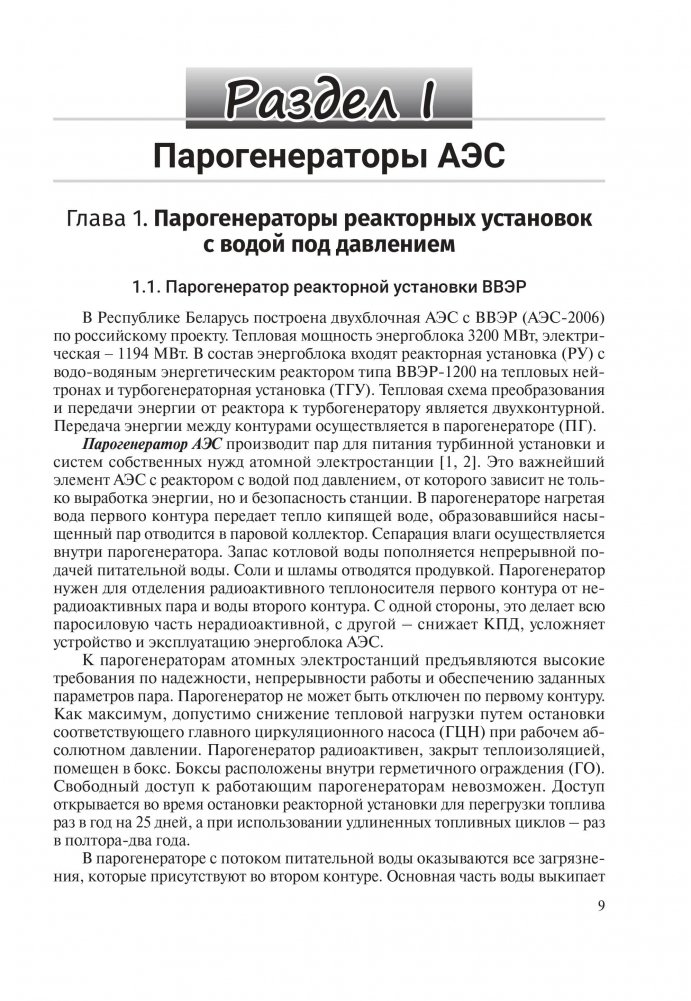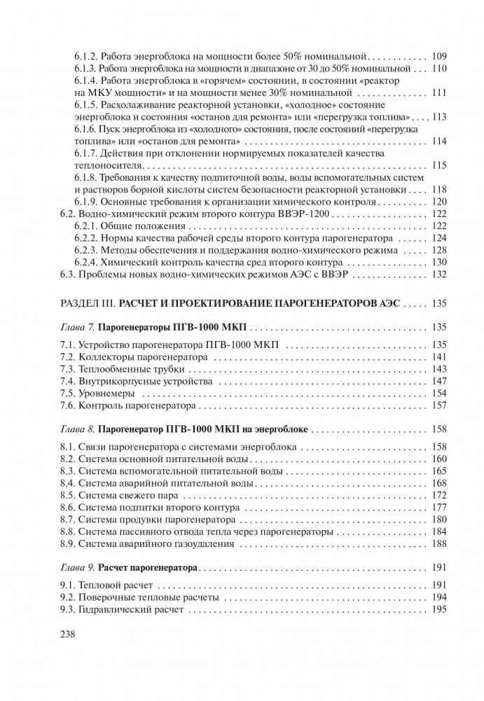 Приведены данные о процессах кипения воды в условиях энергетического парогенератора, теплопередаче и движении теплоносителя, об устройстве парогенератора и связанных с ним систем. Рассмотрены парогенераторы реакторных установок ВВЭР, PWR, БН, ВТГР, БРЕСТ. Основное внимание уделено парогенераторам реакторной установки ВВЭР-1200, называемым ПГВ-1000 МКП.