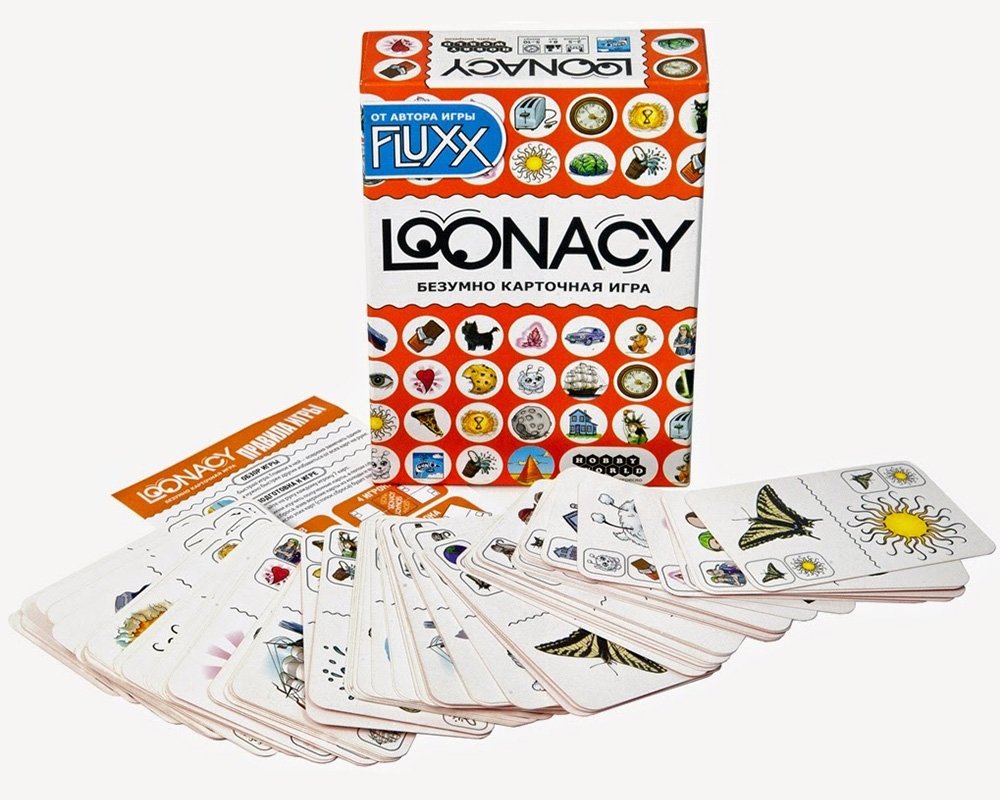 Loonacy (Лунаси) – очень забавная и веселая игра, в которой победит тот, что проворнее и внимательнее. Суть игры заключается в том, чтобы быстрее всех остальных избавится от карт в руке. Сделать это можно только одним способом: сбросить. На каждой карте есть по две картинки, и если одна из них совпадает с картинкой на карте в вашей руке, вы можете сбросить карту. После этого уже картинки только что сброшенной карты являются ориентиром для игроков. Нет никаких ходов, кто быстрее тот и молодец. Единственное правило – сбрасывать по одной карте за раз. Но никто не мешает сбросить хоть всю руку по одной карте, если вы смогли собрать карты с подходящими картинками. Но не обольщайтесь. Другие игроки могут делать то же самое. А если двое участников сбрасывают карту одновременно, засчитывается та, которая первая коснулась стопки сброса. А значит необходимо учиться метать картон быстро и метко.