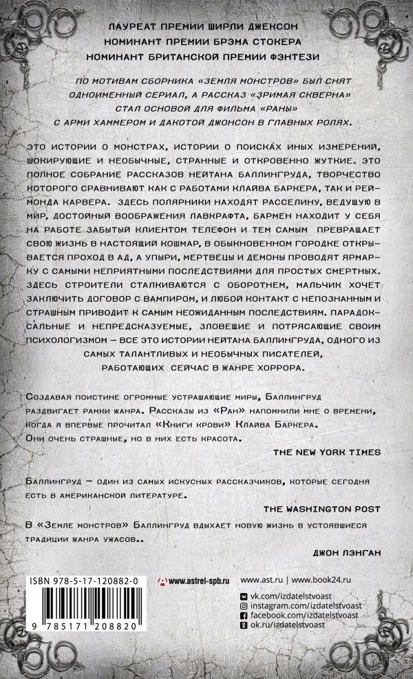Это истории о монстрах, истории о поисках иных измерений, шокирующие и необычные, странные и откровенно жуткие. Это полное собрание рассказов Нейтана Баллингруда, творчество которого сравнивают как с работами Клайва Баркера, так и Реймонда Карвера. Здесь полярники находят расселину, ведущую в мир, достойный воображения Лавкрафта, бармен находит у себя на работе забытый клиентом телефон и тем самым превращает свою жизнь в настоящий кошмар, в обыкновенном городке открывается проход в ад, а вампиры, мертвецы и демоны проводят ярмарку с самыми неприятными последствиями для простых смертных. Здесь строители сталкиваются с оборотнем, мальчик хочет заключить договор с вампиром, и любой контакт с непознанным и страшным приводит к самым неожиданным последствиям. Парадоксальные и непредсказуемые, зловещие и потрясающие своим психологизмом — все это истории Нейтана Баллингруда, одного из самых талантливых и необычных писателей, работающих сейчас в жанре хоррора.
