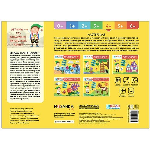 Книга «Декоративное творчество 4+» из серии «Школа Семи Гномов. Мастерская» — это красочный альбом для занятий творчеством с ребенком от 4 до 5 лет. Занятия на близкие и понятные ребенку темы расположены по мере усложнения: поступательно переходя от освоения простых навыков к более сложным заданиям, ребенок научится создавать творческую работу из подручных материалов с помощью клея и пластилина.