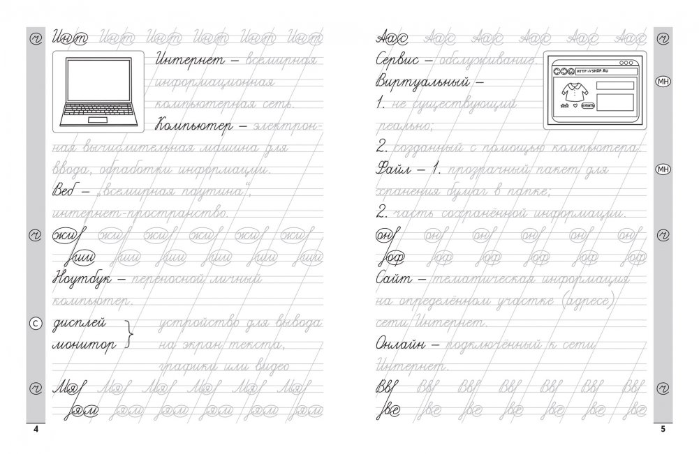 Перед вами тренажёр, в котором собрано более 140 новейших иностранных слов с пояснениями. Тексты и задания не только позволят потренироваться в классическом написании сложных элементов букв и росчерков, но и расширят, обогатят язык ребёнка. Увлекательные задания не дадут ребёнку заскучать и одновременно помогут развить мыслительные и логические навыки. А картинки можно раскрасить, если рука утомилась писать!