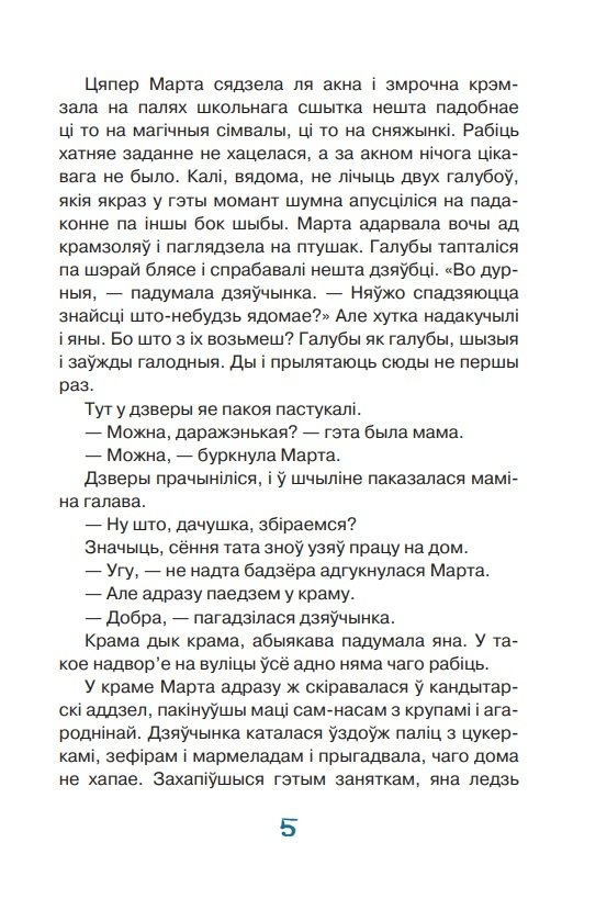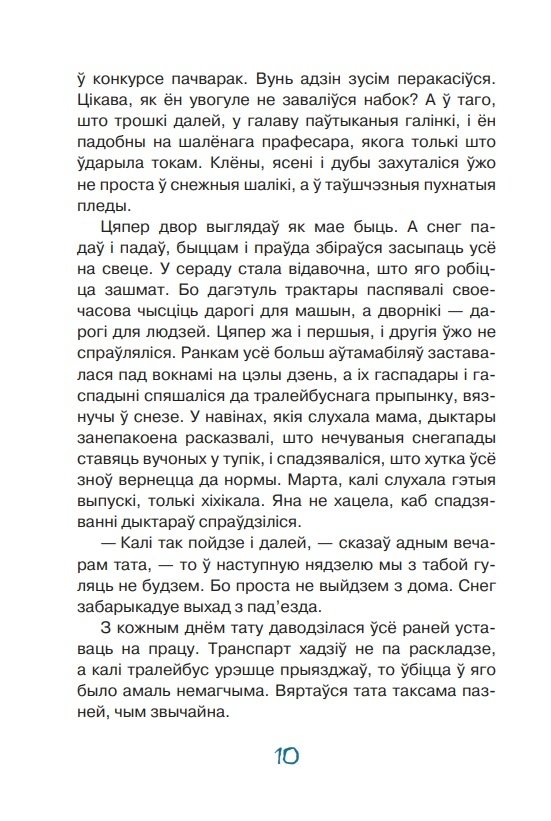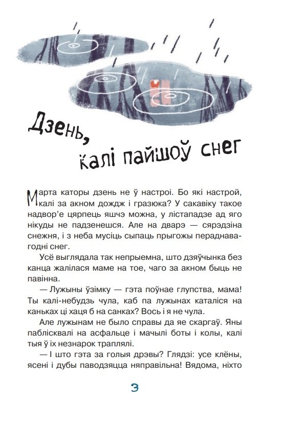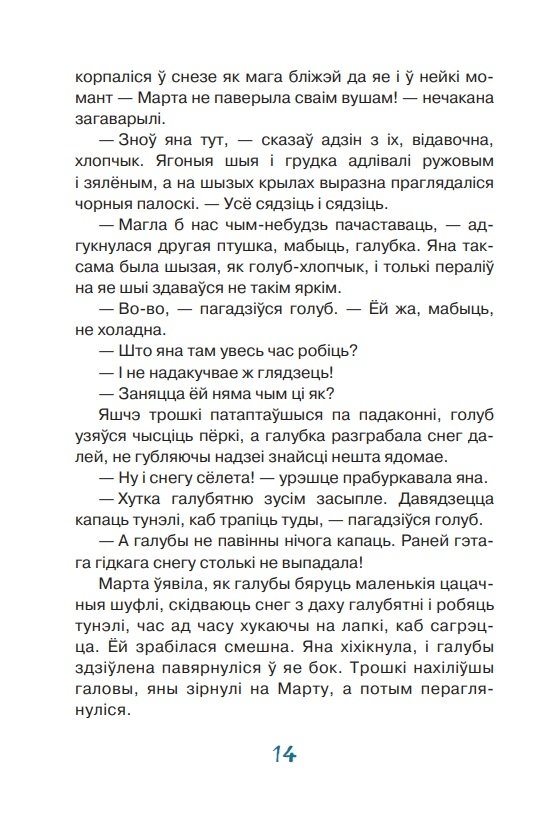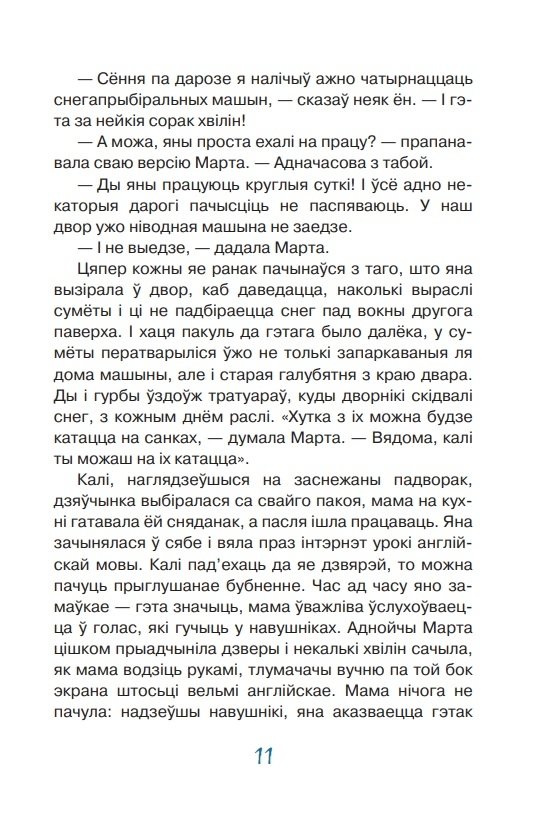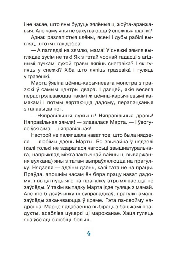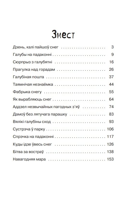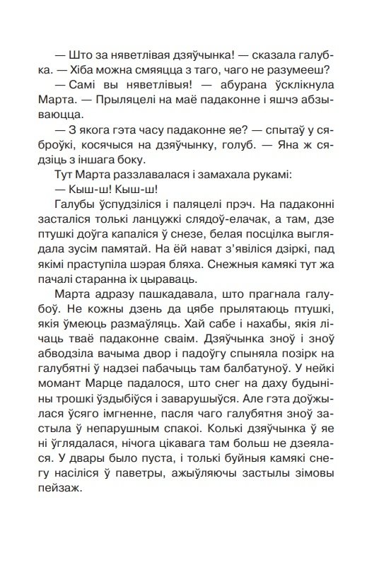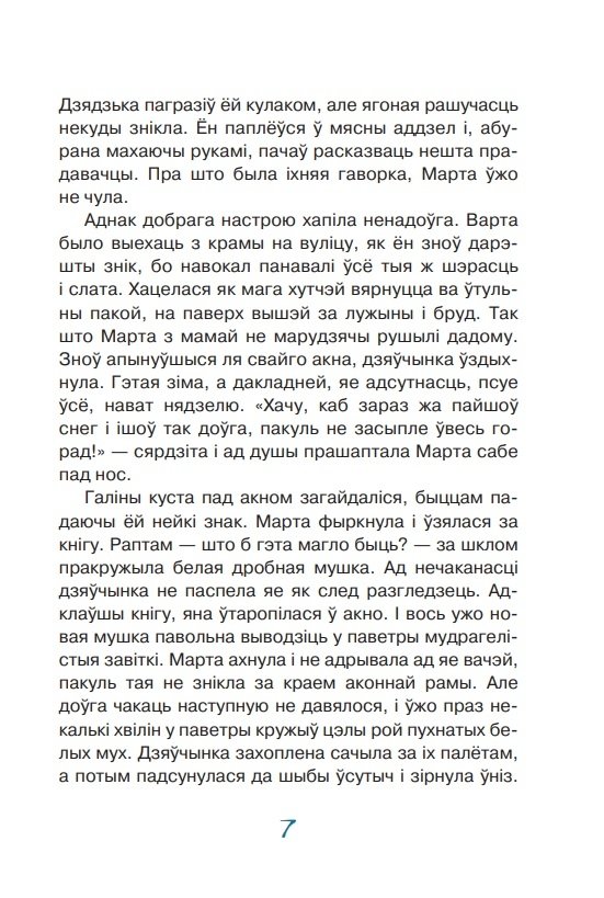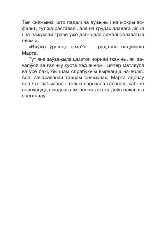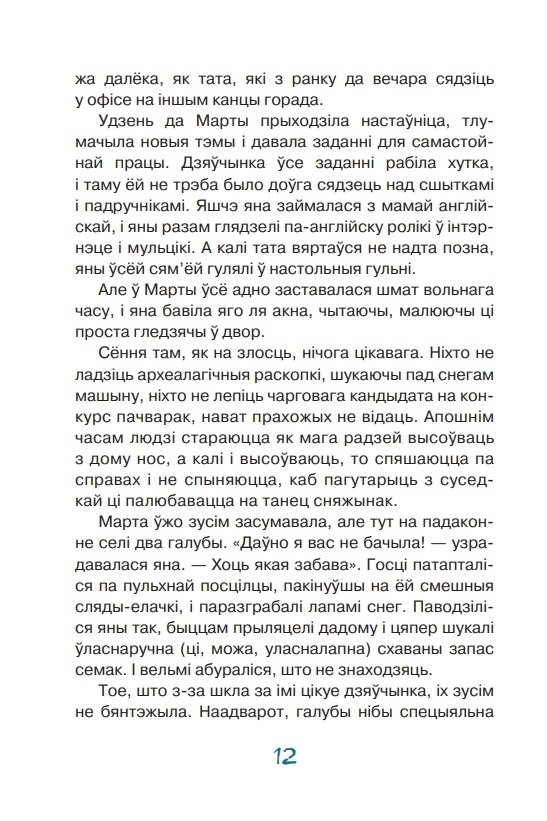 Марце так хочацца ляпіць снегавікоў і гуляць у снежкі! Аднак зіма спазняецца, і на дварэ — толькі лужыны і гразюка. Вядома, вешаць нос не варта, бо калі моцна пра нешта марыш, то мара абавязкова спраўдзіцца. Толькі асцярожна: часам гэта прыводзіць да нечаканых наступстваў... Калі ў горадзе пачынаецца самы грандыёзны ў свеце снегапад, Марта і яе новыя сябры мусяць разабрацца, хто ці што за гэтым стаіць. І запомні: галубы на падаконні — прыкмета таго, што цябе чакаюць неверагодныя прыгоды.