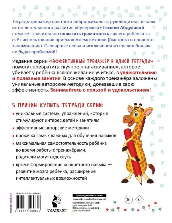 Как часто современные дети сталкиваются с проблемой безграмотного письма! Но чтобы получать пятёрки за диктанты, недостаточно просто зубрить словарные слова и правила. Система простых и увлекательных упражнений опытного нейропсихолога, руководителя школы интеллектуального развития "Супермозг" Гюзели Абдуловой поможет овладеть самыми эффективными приёмами мнемотехники и всего за 60 занятий сформировать навык запоминания словарных слов и орфографической зоркости. С этой тетрадью-тренажёром абсолютная грамотность достижима!