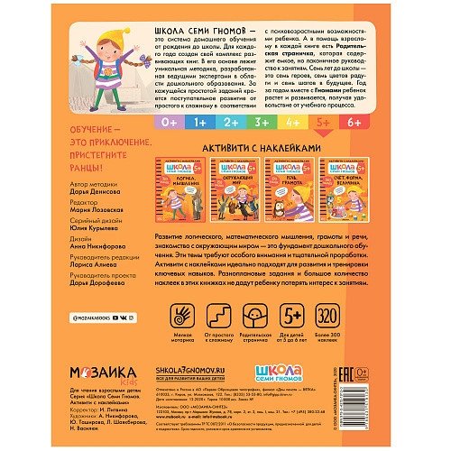 Книга «Логика, мышление 5+» из серии «Школа Семи Гномов. Активити с наклейками» предназначена для развития и тренировки логического мышления детей от 5 до 6 лет.