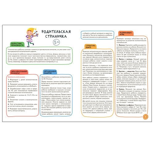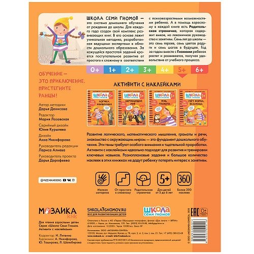 Книга «Счет, форма, величина 5+» из серии «Школа Семи Гномов. Активити с наклейками» предназначена для формирования и развития у детей от 5 до 6 лет элементарных математических представлений, способности измерять величину предметов, определять их форму.