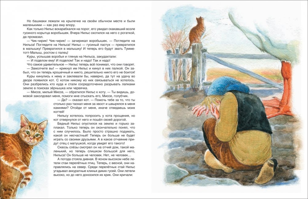 Герой этой замечательной сказочной повести мальчик Нильс, однажды превращенный в крохотного человечка, совершает удивительное путешествие по родной Швеции вместе со стаей диких гусей. Увлекательные приключения и трудные испытания учат Нильса быть честным и смелым, а верные друзья всегда приходят ему на помощь.