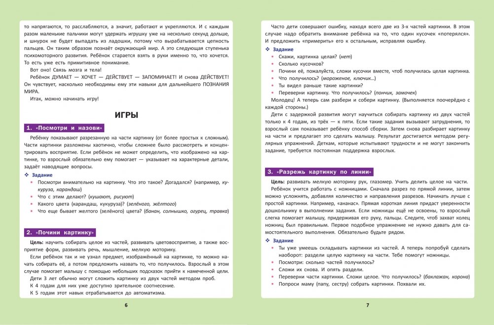 Книга содержит коррекционно-развивающие и диагностические материалы для детей 3-5 лет. Они представлены в виде карточек-картинок, предназначенных для разрезания и сборки, и сопровождаются заданиями, направленными на развитие восприятия и мелкой моторики дошкольников, а также дополнены упражнениями для развития речи, мышления и творческих способностей детей. Задания подобраны по разным уровням сложности в зависимости от возрастных и индивидуальных особенностей ребенка-дошкольника.