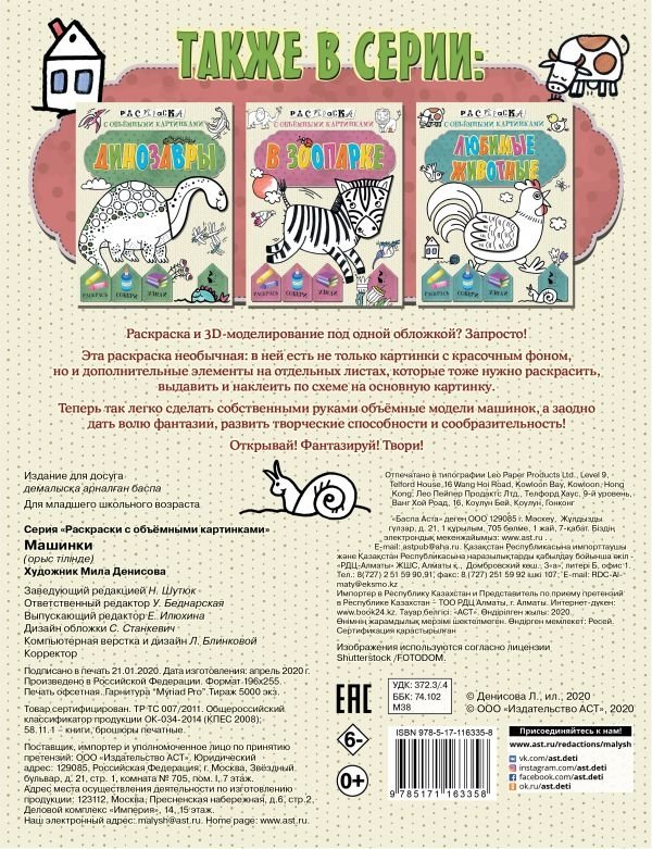 Эта раскраска необычная: в ней есть не только картинки с красочным фоном, но и дополнительные элементы на отдельных листах, которые тоже нужно раскрасить, выдавить и наклеить по схеме на основную картинку. Теперь так легко сделать собственными руками объемные модели машин, а заодно дать волю фантазии, развить творческие способности и сообразительность!