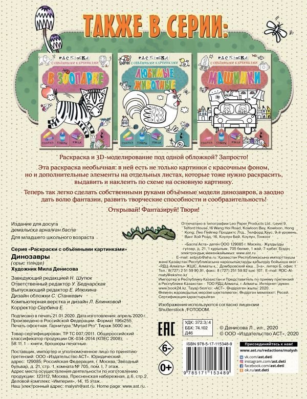 Эта раскраска необычная: в ней есть не только картинки с красочным фоном, но и дополнительные элементы на отдельных листах, которые тоже нужно раскрасить, выдавить и наклеить по схеме на основную картинку. Теперь так легко сделать собственными руками объемные модели динозавров, а заодно дать волю фантазии, развить творческие способности и сообразительность!