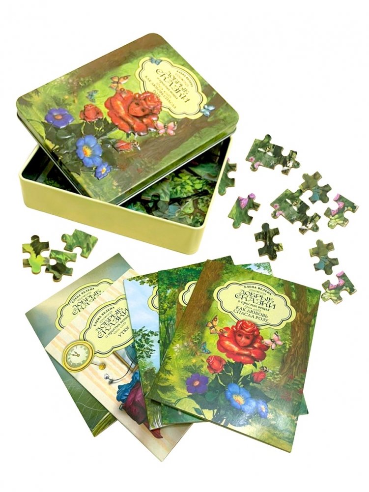 Набор в жестяной коробочке "Как любовь спасла Розу": 5 мини-книг. Пазл (60 деталей)