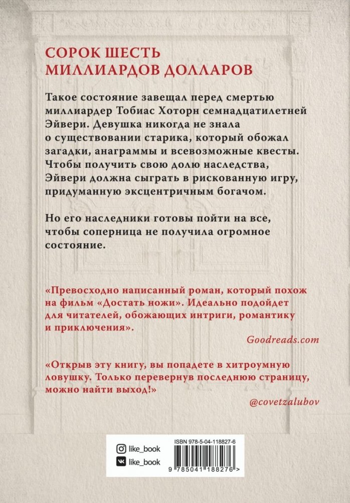 Сорок шесть миллиардов долларов. Такое состояние завещал перед смертью миллиардер Тобиас Хоторн семнадцатилетней Эйвери. Девушка никогда не знала о существовании старика, который обожал загадки, анаграммы и всевозможные квесты. Чтобы получить свою долю наследства, Эйвери должна сыграть в рискованную игру, придуманную эксцентричным богачом. Но его наследники готовы пойти на все, чтобы соперница не получила огромное состояние.