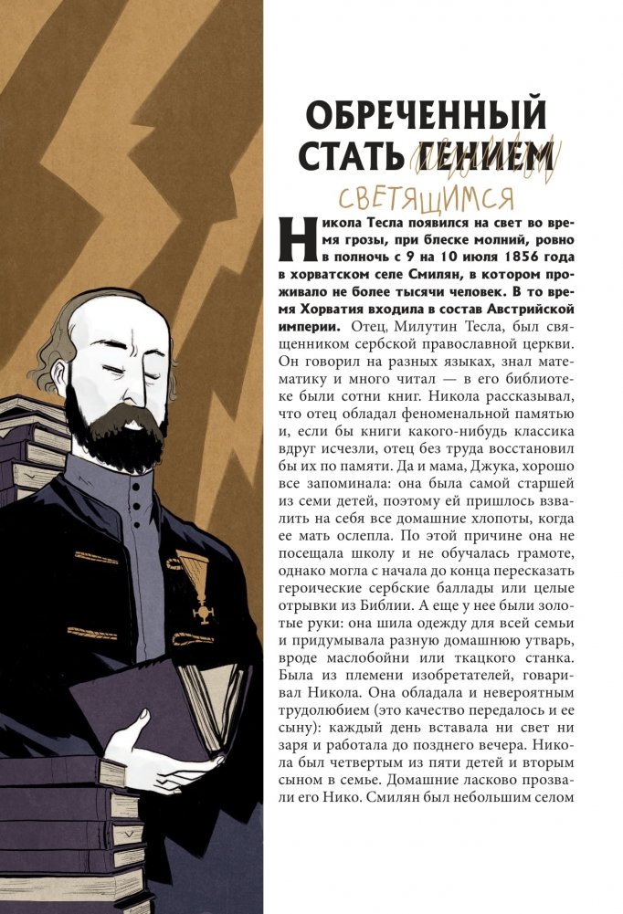 Мечтатель и мистик Никола Тесла не мог объяснить ни своей боязни микробов, ни страсти к числам, делящимся на три, однако умел покорять молнии и превращать ночь в день. Он изобрел двигатель переменного тока и стал родоначальником беспроводной связи, но умер в полном забвении. Иллюстрированная биография Теслы расскажет о непростом пути великого изобретателя: как он покорял своими изобретениями Европу и Америку, о работе, а затем и противостоянии с Томасом Эдисоном, о сложностях с финансированием и патентами. О том, как частные компании наживались на его труде, в то время как сам изобретатель провел жизнь в нищете, настоящее признание получив только после смерти. По-настоящему темная история — в учебниках такого не напишут!