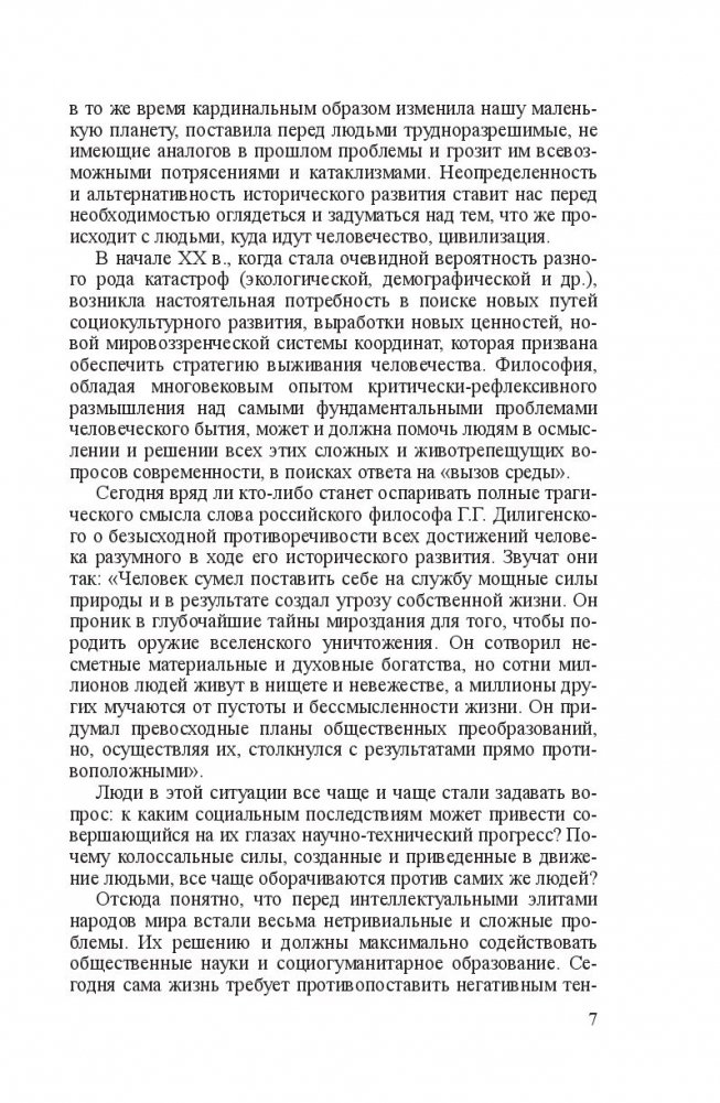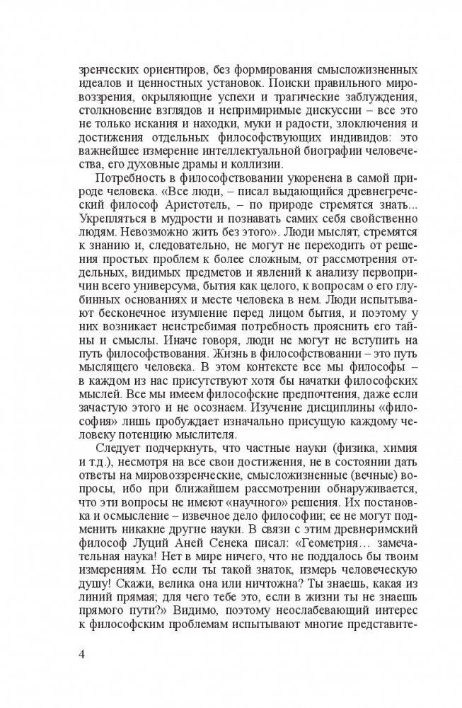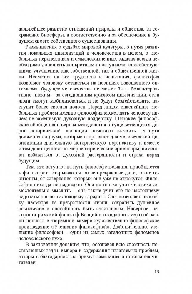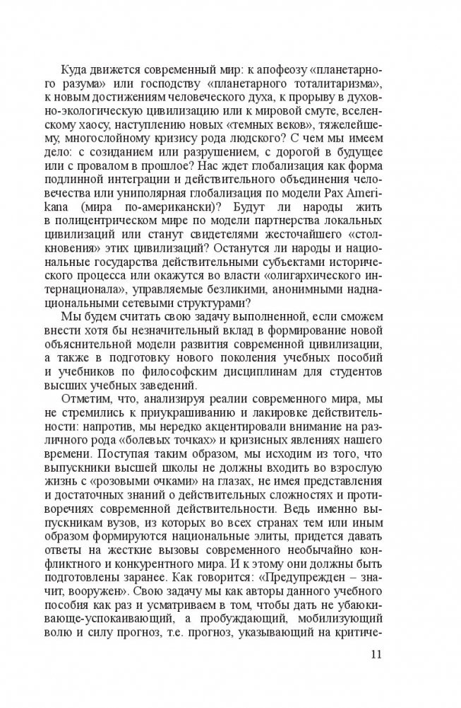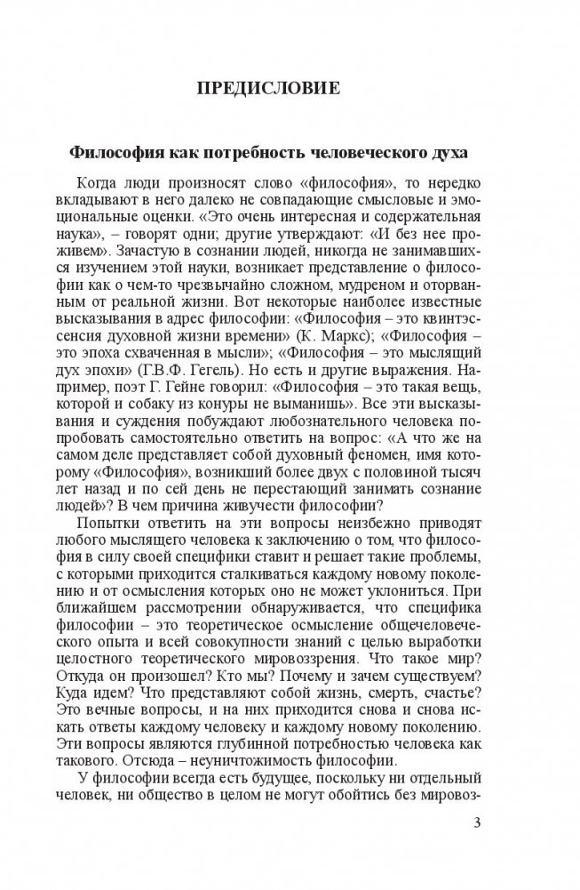 Излагается полный курс философии, структурированный в соответствии с государственным образовательным стандартом и новыми требованиями экспериментальной типовой программы интегрированного модуля «Философия». Содержит информацию о ведущих разделах философского знания: онтологии (учение о бытии), гносеологии (учение о познании), философской антропологии (учение о человеке), социальной философии и философии истории. Использованы новейшие достижения мировой философии. Авторы обращают внимание на трансформацию проблем современной научной и философской мысли в связи с процессами глобализации экономики, политики и культуры на рубеже ХХ–ХХI в.