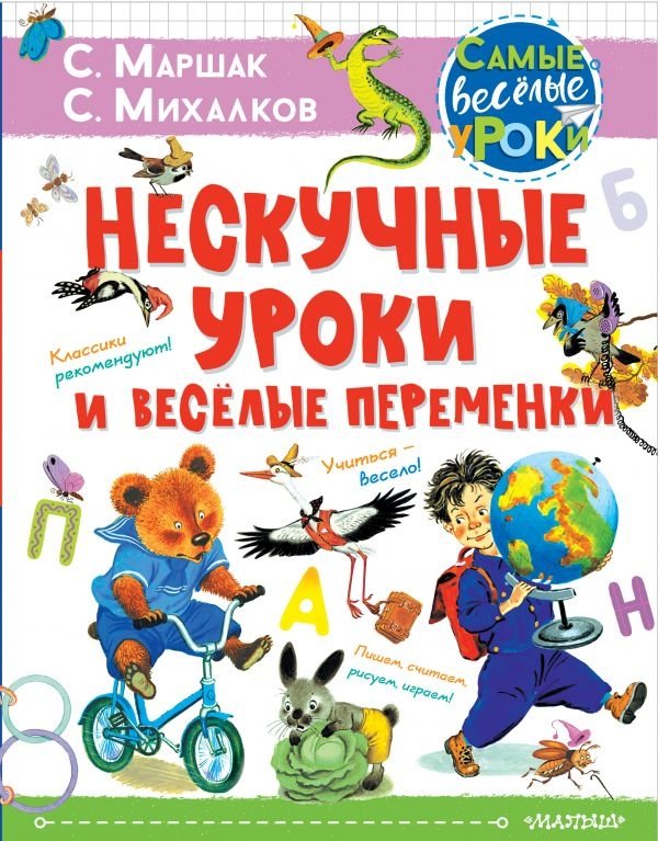 Книга «Нескучные уроки и весёлые переменки» состоит из нескольких разделов: «Учим буквы», «Считаем», «Играем», «Мир вокруг нас» и «Рисуем». В каждой части ребёнку предлагается прочитать стихи С. Маршака и С. Михалкова и познакомиться с буквами, цифрами, временами года, научиться рисовать. На каждой странице ребят ждут интересные задания. Учиться с классиками детской литературы очень интересно!