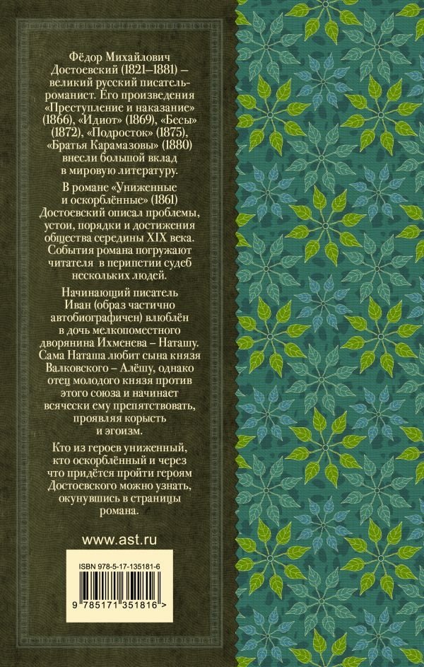 Фёдор Михайлович Достоевский (1821—1881) — великий русский писатель-романист. Его произведения "Преступление и наказание" (1866), "Идиот" (1869), "Бесы" (1872), "Подросток" (1875), "Братья Карамазовы" (1880) внесли большой вклад в мировую литературу. В романе "Униженные и оскорблённые" (1861) Достоевский описал проблемы, устои, порядки и достижения общества середины XIX века. События романа погружают читателя в перипетии судеб нескольких людей. Начинающий писатель Иван (образ частично автобиографичен) влюблён в дочь мелкопоместного дворянина Ихменева – Наташу. Сама Наташа любит сына князя Валковского – Алёшу, однако отец молодого князя против этого союза и начинает всячески ему препятствовать, проявляя корысть и эгоизм. Кто из героев униженный, кто оскорблённый и через что придётся пройти героям Достоевского можно узнать, окунувшись в страницы романа.