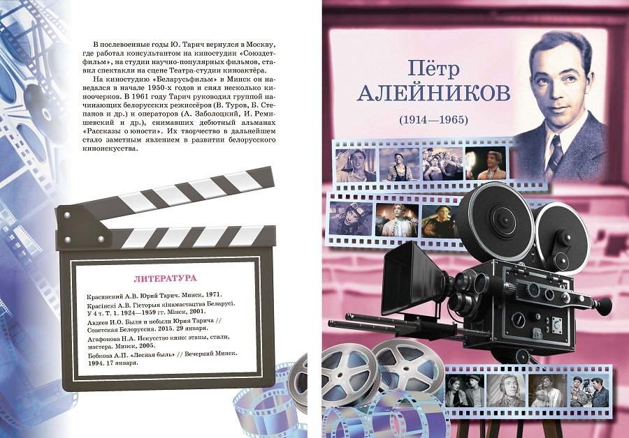 В книге в популярной форме рассказывается об известных мастерах кино, жизнь и творчество которых тесно связаны с Беларусью. Режиссёр Юрий Тарич известен как основоположник белорусского кино и автор первого белорусского фильма «Лесная быль». Актёр Пётр Алейников родился и вырос в Беларуси, создал неповторимые и яркие образы в популярных фильмах, среди которых «Семеро смелых», «Трактористы» и «Большая жизнь». Режиссёры Владимир и Елена Петкевич своими выразительными анимационными лентами принесли европейскую славу белорусской мультипликации. Книга адресована учащимся и преподавателям учебных заведений как дополнительная литература в курсе отечественной и мировой художественной культуры, а также тем, кто интересуется историей кино.