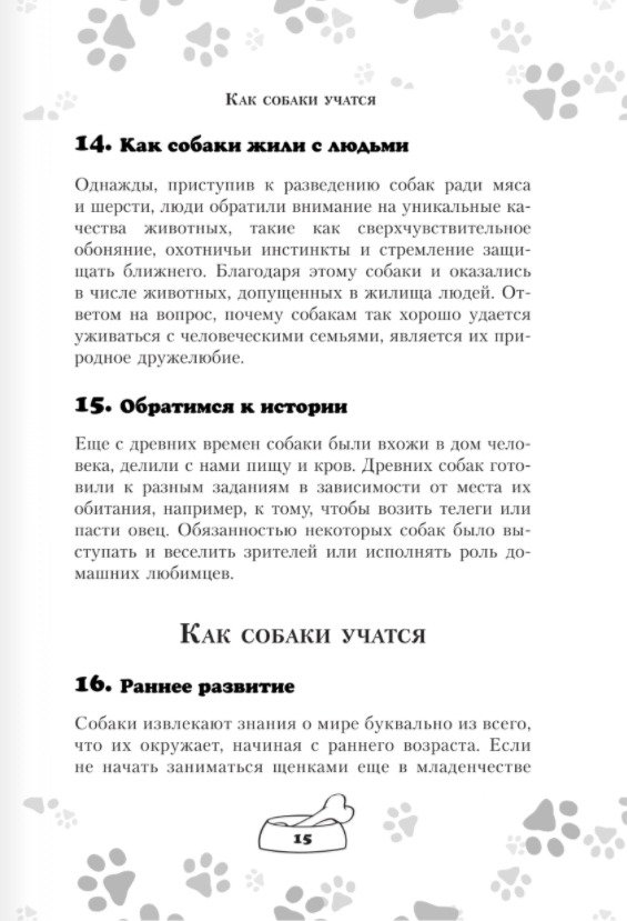 Данный сборник советов предложит лаконичные инструкции, которые пригодятся хозяину в процессе дрессировки домашнего любимца. Они также помогут ему найти выход из сложных ситуаций и позволят разобраться в том, как правильно заботиться о здоровье питомца. Эта книга поделится с вами информацией обо всем: о том, какие сообщения посылает собака поскуливая или переходя на вой; она объяснит, как расшифровать лай и справиться с непослушанием. Взявшись за чтение, вы сможете узнать, как правильно мыть собаку, научить ее общаться с детьми и как насладиться путешествием на автомобиле в компании своего четвероногого друга.