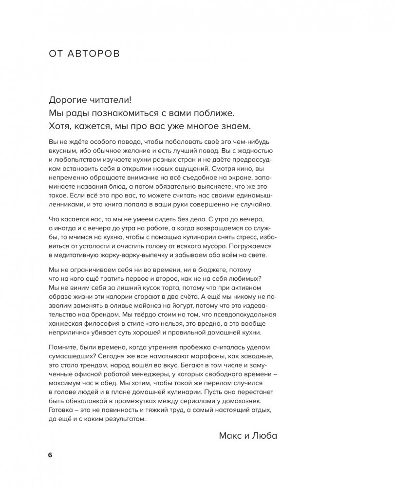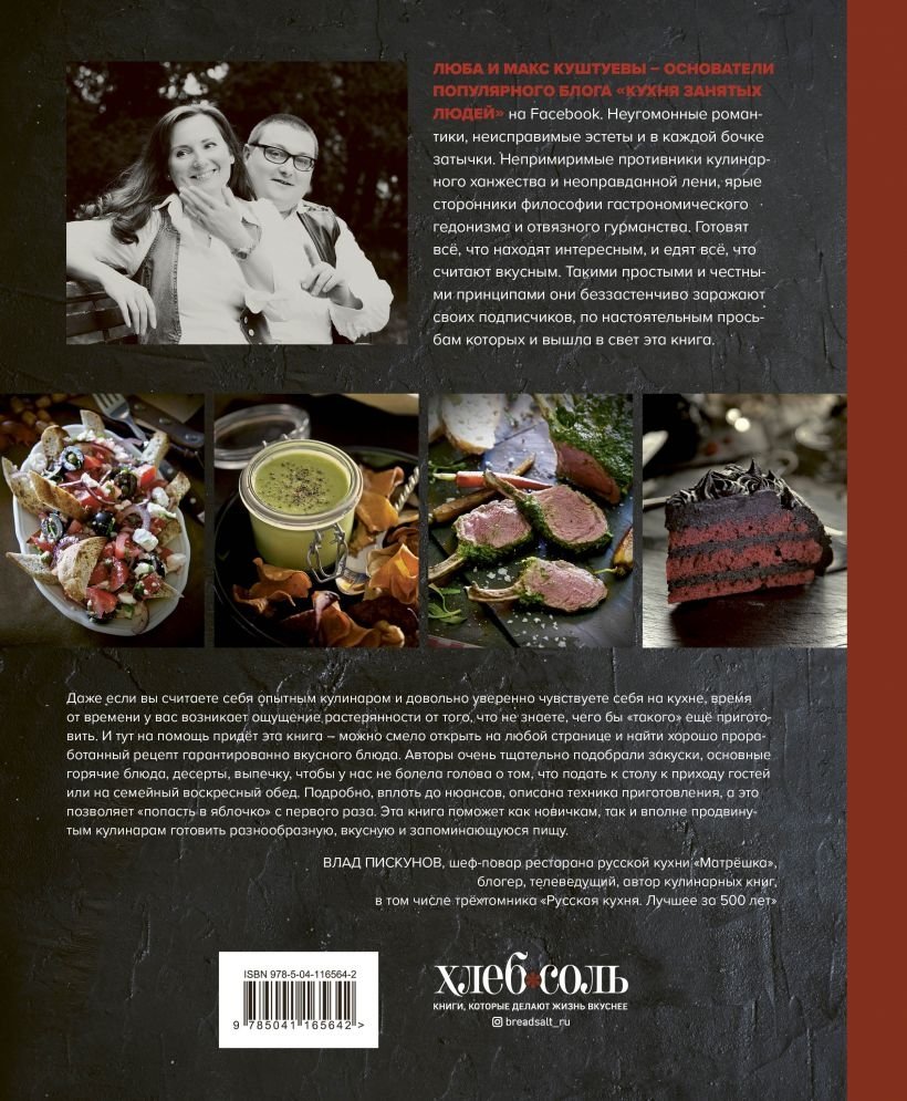 Если вы увлеченный кулинар или хотите им стать, и для вас главное — вкус блюда, а не простота и скорость его приготовления, то в новой книге гастрономических писателей и известных блогеров Любови и Максима Куштуевых, чью страницу о еде в фейсбуке "Кухня занятых людей" читает и любит многотысячная аудитория, вы найдете не только оригинальные рецепты потрясающе вкусных блюд, но и особое поварское вдохновение для своих новых свершений на кухне.