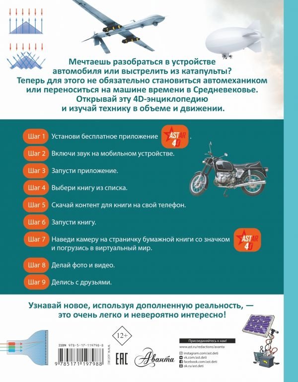 Эта книга рассказывает о различных машинах и механизмах, придуманных людьми за историю нашей цивилизации. За устройством и работой самых различных технических изобретений теперь можно наблюдать прямо на этих страницах, ведь это не обычная книга, а 4D-издание! Читай, изучай иллюстрации, рассматривай объемные движущиеся модели, слушай познавательные аудиозаписи. Элементы дополненной реальности обязательно помогу новым знаниям запомниться надолго.