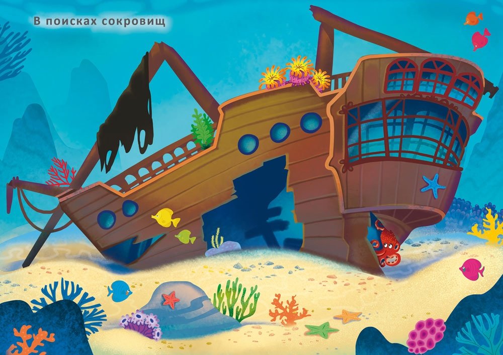 Более 600 ярких наклеек с изображениями рыб, растений, животных, волшебных персонажей и таинственных сокровищ, а также красочные страницы с фонами для заполнения.
