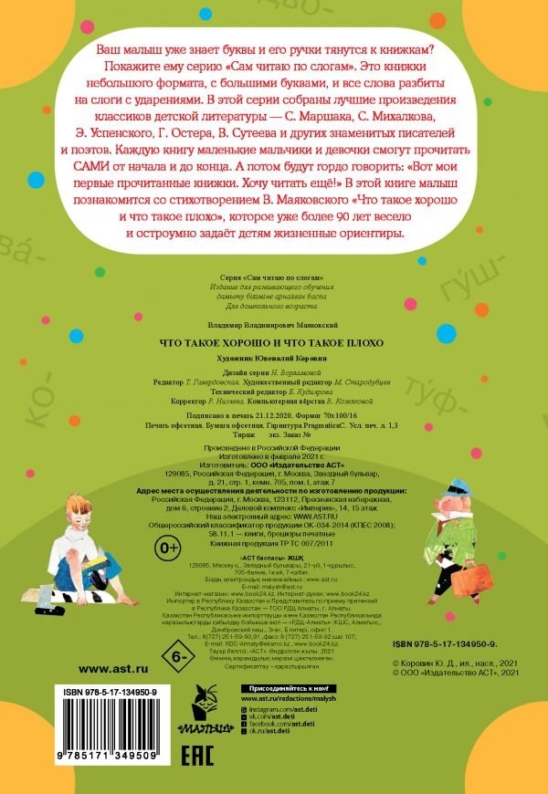 Ваш малыш уже знает буквы и его ручки тянутся к книжкам? Покажите ему серию «Сам читаю по слогам». Это книжки небольшого формата, с большими буквами, и все слова разбиты на слоги с ударениями. В этой серии собраны лучшие произведения классиков детской литературы — С. Маршака, С. Михалкова, Э. Успенского, Г. Остера, В. Сутеева и других знаменитых писателей и поэтов. Каждую книгу маленькие мальчики и девочки смогут прочитать САМИ от начала и до конца. А потом будут гордо говорить: «Вот мои первые прочитанные книжки. Хочу читать ещё!» В этой книге малыш познакомится со стихотворением В. Маяковского «Что такое хорошо и что такое плохо», которое уже более 90 лет весело и остроумно задаёт детям жизненные ориентиры.