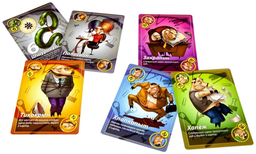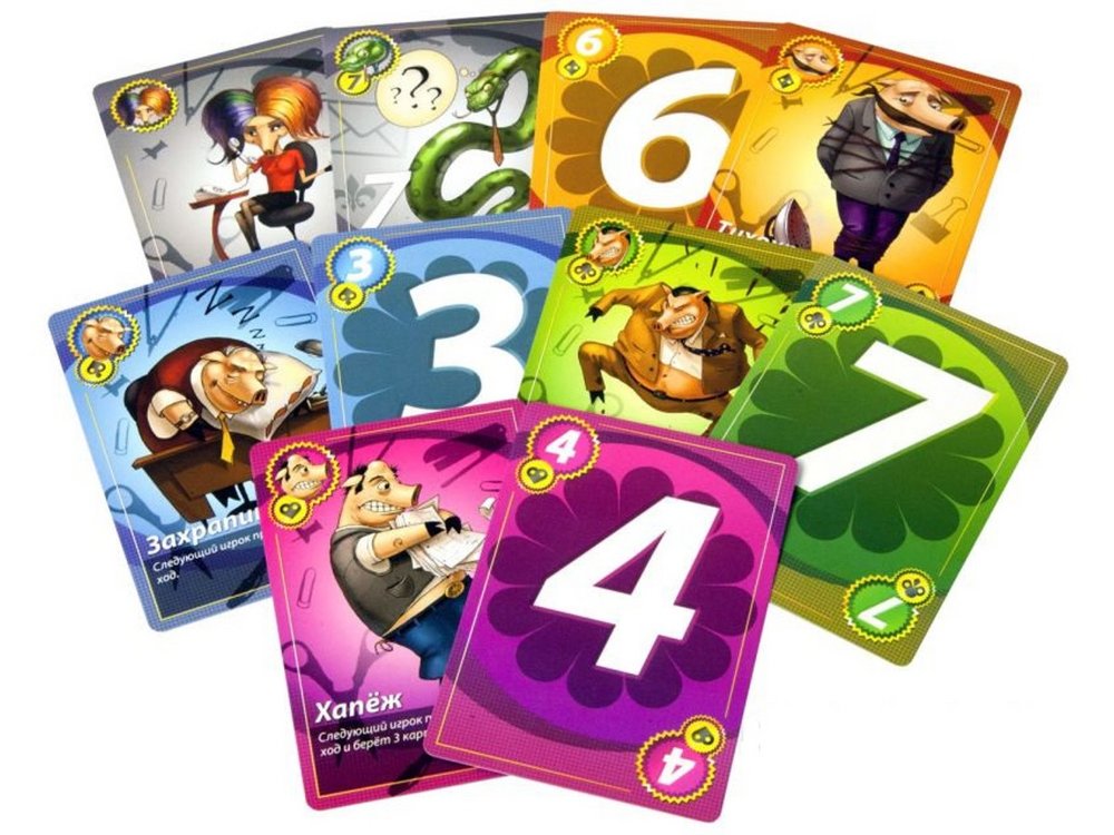 Базовые правила не изменились, зато добавились новые! Карты «Змеиной Чопорности» можно сыграть двумя способами: разыграть, как обычную карту с номиналом и загадать цвет, но второй способ гораздо интереснее — карту можно сыграть вне очереди в тот момент, когда кто-то из соперников совершает предписанное картой действие, а вы отдаёте вместе с картой две дополнительные. Карты типа «Шинкогнито» или «Шмотрун» подарят вам уйму новых ощущений от игры!