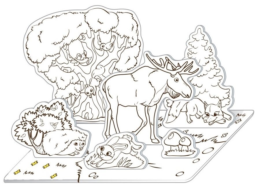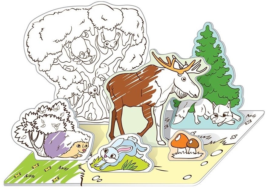 Откройте конверт и достаньте все детали объёмной ЗD-раскраски торговой марки Malamalama. Это не просто раскраска, а ещё и конструктор. Предлагаем ребёнку перед сборкой самостоятельно выбрать цвета, раскрасить все детали и собрать свою маленькую лесную полянку.