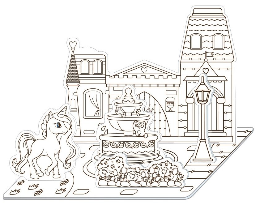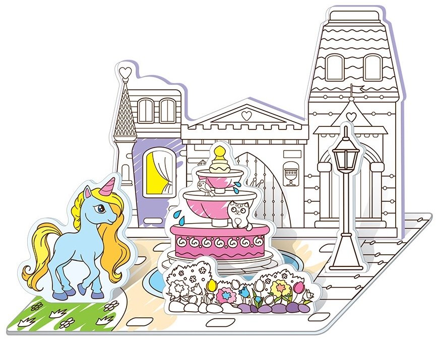 Откройте конверт и достаньте все детали объёмной ЗD-раскраски торговой марки Malamalama. Это не просто раскраска, а ещё и конструктор. Предлагаем ребёнку перед сборкой самостоятельно выбрать цвета, раскрасить все детали и собрать свой маленький сказочный город.