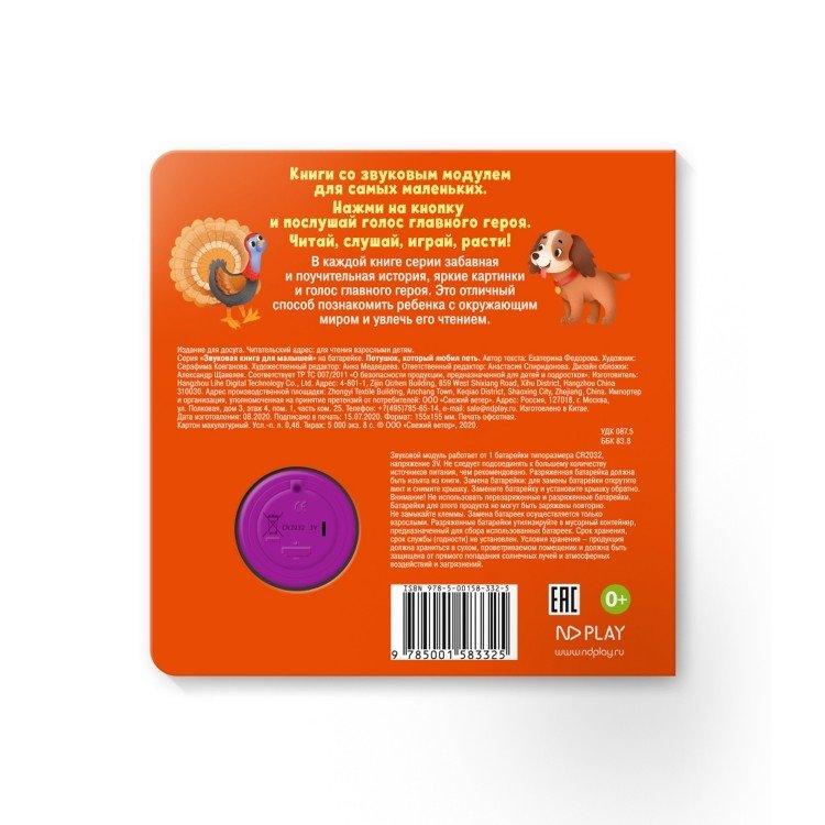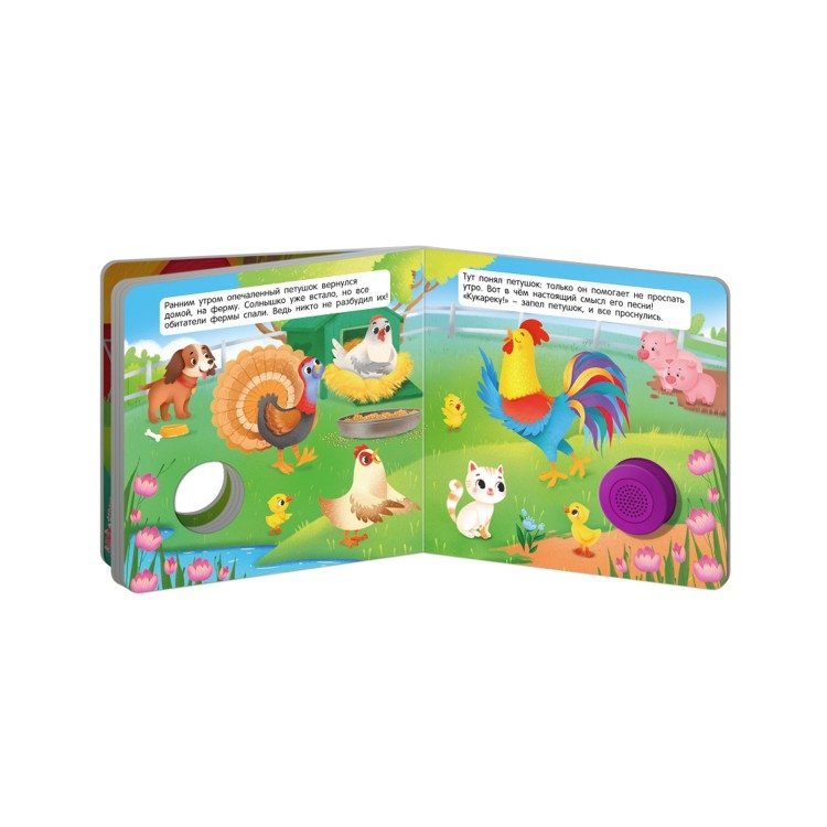 Книги со звуковым модулем для самых маленьких. Нажми на кнопку и послушай голос главного героя. Читай, слушай, играй, расти! В каждой книге серии забавная и поучительная история, яркие картинки и голос главного героя. Это отличный способ познакомить ребенка с окружающим миром и увлечь его чтением. Малыш будет с удовольствием рассматривать яркие страницы и читать историю главных героев книги. Книжка сделана из плотного картона с глянцевой ламинацией, поэтому родители могут не опасаться, что ребёнок порвёт странички. Благодаря компактному формату (15,5х15,5 см) её удобно брать с собой в дорогу. Книжка укомплектована батарейками. Одна кнопка - один звук.