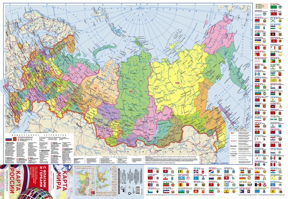 Складная карта содержит политическую карту мира и политико-административную карту России, карта дополнена флагами, гербами и справочной информацией с указанием площади территорий, численности населения, столиц и центров государств мира и субъектов РФ.