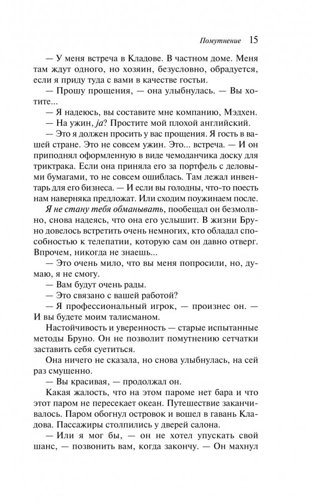 "Помутнение" — это роман-игра, таинственная, непредсказуемая. Он о людях, переставляющих на доске не только фишки, но и других людей. Какие у этой игры правила и чьи маски окажутся сорванными в конце? Александер Бруно — профессиональный игрок в триктрак. Он красив, умен, мастерски вытягивает деньги из богачей, а еще он наделен телепатическими способностями. Однако в последнее время их блокирует пятно, появившееся перед глазами из-за растущей в голове опухоли. К кому придется обратиться, когда обстоятельства доведут Александера до критических пределов, и он останется без денег, с подорванным здоровьем? Ему предстоит ответить на важный вопрос: играет он сам или же он простая фишка в игре жизни?