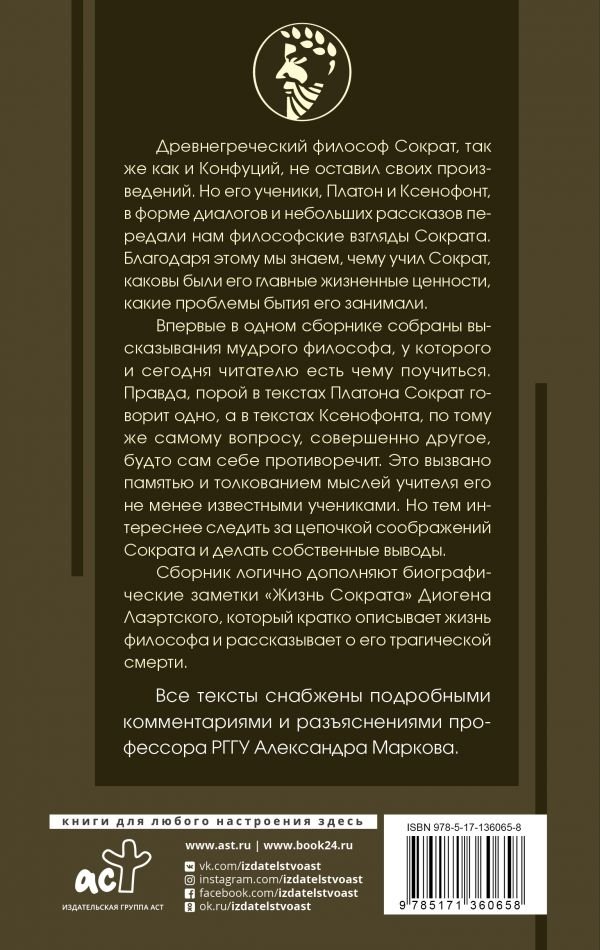 Впервые в одном сборнике собраны высказывания мудрого философа, у которого и сегодня читателю есть чему поучиться. Правда, порой в текстах Платона Сократ говорит одно, а в текстах Ксенофонта, по тому же самому вопросу, совершенно другое, будто сам себе противоречит. Это вызвано памятью и толкованием мыслей учителя его не менее известными учениками. Но тем интереснее следить за цепочкой соображений Сократа и делать собственные выводы.