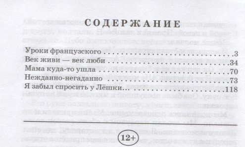 В книгу выдающегося мастера современной художественной литературы Валентина Григорьевича Распутина (1937-2015) вошли произведения школьной программы: «Уроки французского», «Век живи — век люби», «Мама куда-то ушла», «Нежданно-негаданно» и «Я забыл спросить у Лёшки...». Это рассказы о детстве, о ребятах, оказавшихся в непростых жизненных ситуациях. Главная их тема — справедливость, чувство собственного достоинства, доброта, умение доверять и помогать друг другу.