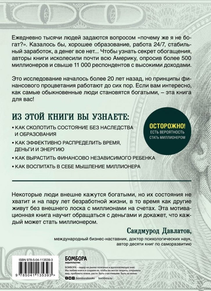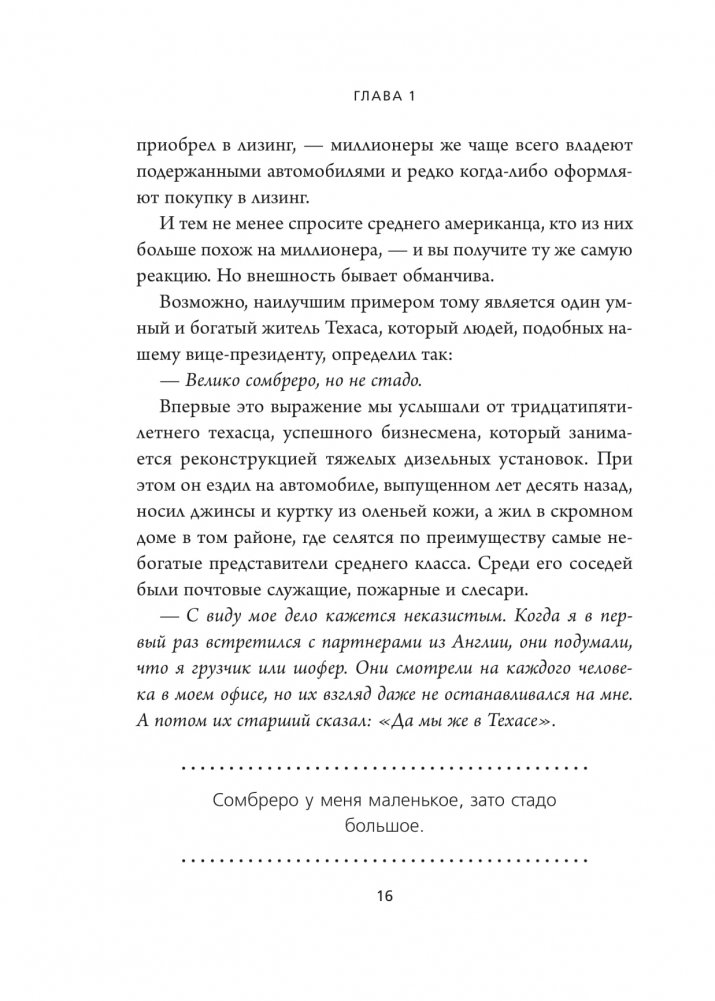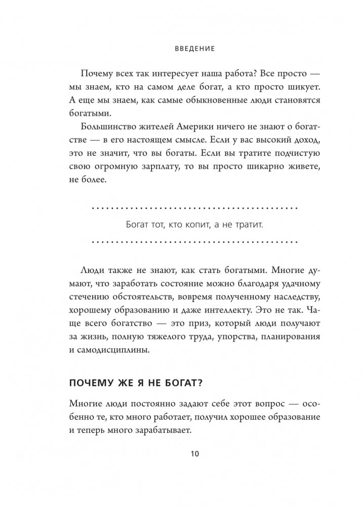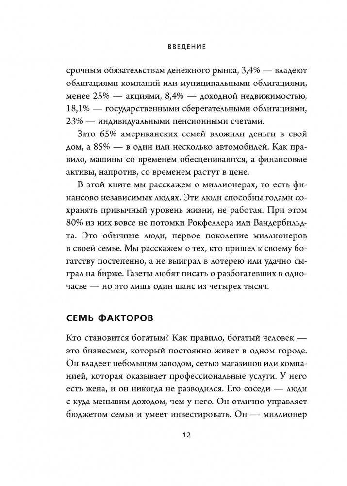 Ежедневно тысячи людей задаются вопросом "почему же я не богат?" Казалось бы, хорошее образование, работа 24/7, стабильный заработок, а денег все нет... Чтобы узнать секрет обогащения, авторы книги исколесили почти всю Америку, опросив более 500 миллионеров и свыше 11 000 респондентов с высокими доходами. Это исследование началось более 20 лет назад, но принципы финансового процветания работают до сих пор. Если вам интересно, как самые обыкновенные люди становятся богатыми – эта книга для вас!
