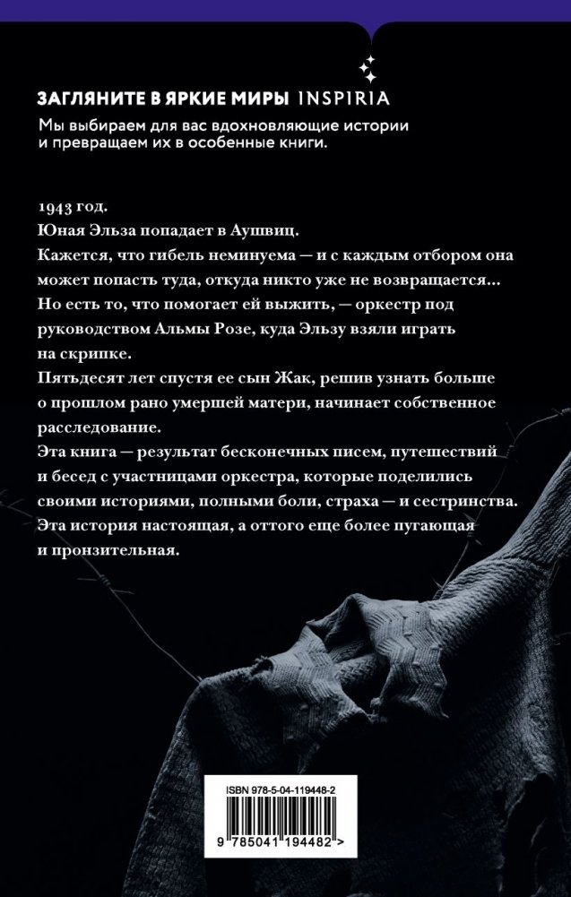 1943 год. Юная Эльза попадает в Освенцим. Кажется, что гибель неминуема, — и с каждым отбором она может попасть туда, откуда никто уже не возвращется… Но кое-что помогает ей выжить. Оркестр под предводительством Альмы Розе, куда Эльзу взяли играть на скрипке. Пятьдесят лет спустя ее сын Жак, вознамерившись узнать больше о прошлом рано умершей матери, начинает собственное расследование. Эта книга — результат бесконечных писем, путешествий и бесед с участницами оркестра, которые поделились своими историями, полными боли, страха - и сестринства. Эта история настоящая, а оттого еще более пугающая и пронзительная.
