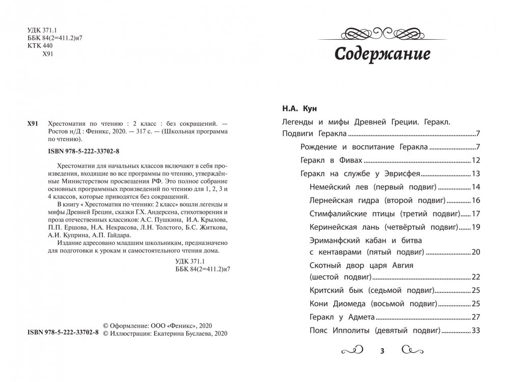 В книгу « Хрестоматия по чтению: 2 класс» вошли легенды и мифы Древней Греции, сказки Г.Х. Андерсена, стихотворения и проза отечественных классиков: А.С. Пушкина, И.А. Крылова,