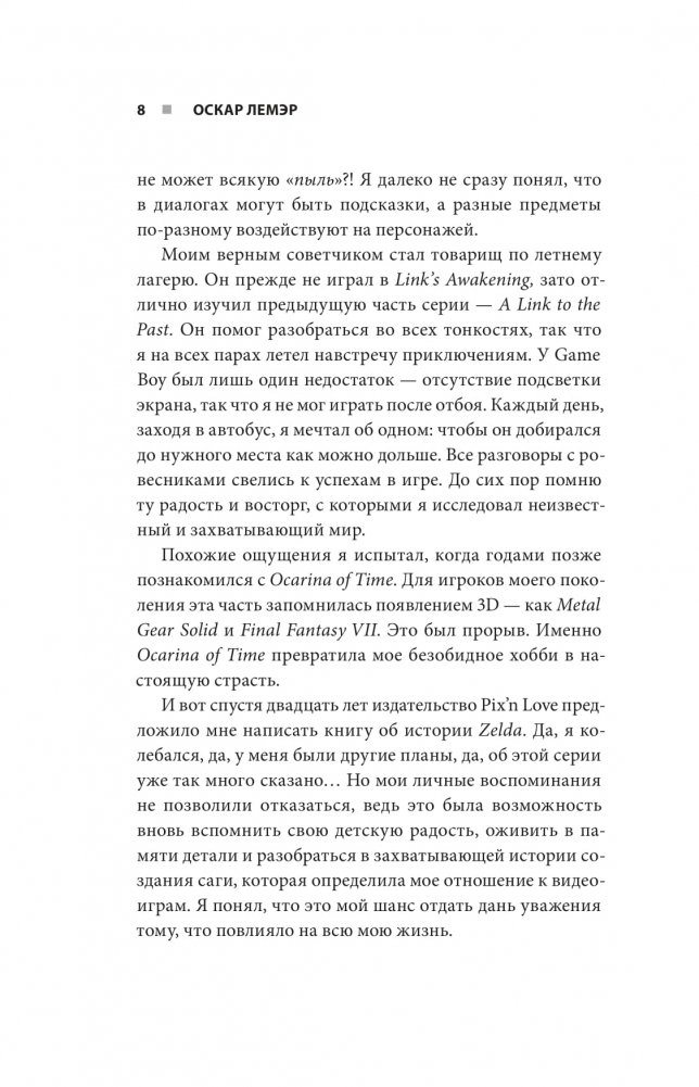 Перенесемся в середину 1980-х годов, когда небольшая команда разработчиков из Nintendo трудилась над игрой, которой будет суждено стать любимицей геймеров со всего мира. Во главе этой команды был Сигэру Миямото, чье имя давно закрепилось в списках величайших геймдизайнеров всех времен. Вы узнаете о первых годах разработки серии Zelda, о том, как зарождалась идея игры, как она развивалась, воплощалась и эволюционировала под действием мастерства и энтузиазма команды. Вы узнаете, почему Zelda стала настоящим прорывом, какие ограничения мешали разработке, а также, как работала легендарная студия под руководством Миямото, которая сделала мечту возможной.