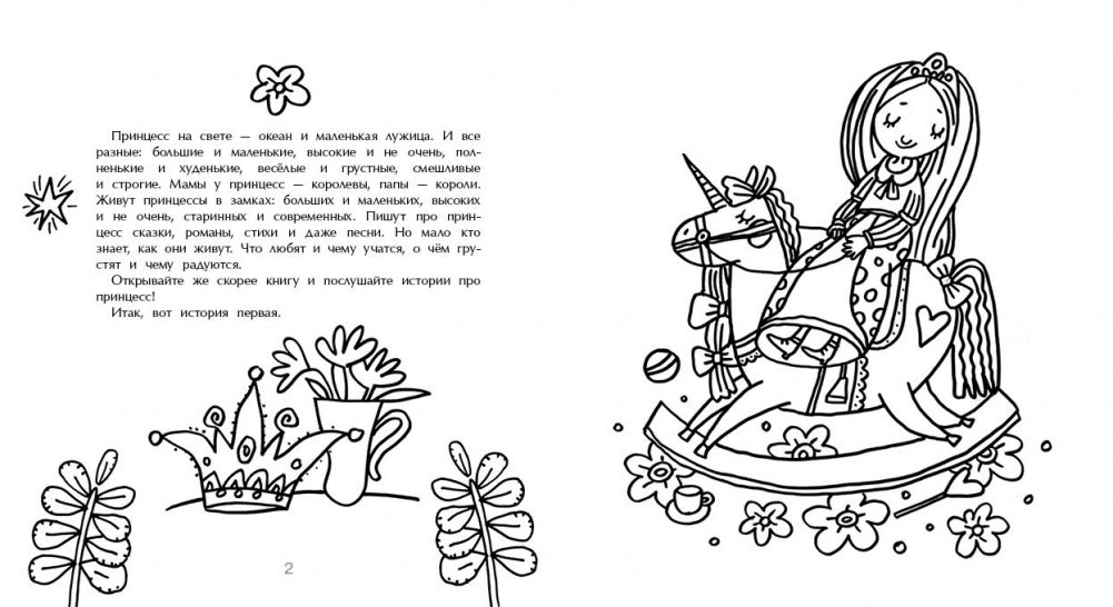 Принцесс на свете — океан и маленькая лужица. И все разные: большие и маленькие, высокие и не очень, полненькие и худенькие, весёлые и грустные, смешливые и строгие. Мамы у принцесс — королевы, папы — короли. Живут принцессы в замках: больших и маленьких, высоких и не очень, старинных и современных. Пишут про принцесс сказки, романы, стихи и даже песни. Но мало кто знает, как они живут. Что любят и чему учатся, о чём грустят и чему радуются.