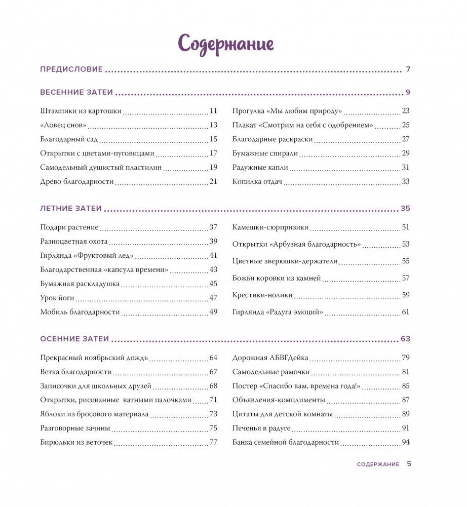 Умение говорить спасибо — важнейшее человеческое качество. Джоанна Гжешчак — психолог, декоратор, блогер, фотограф и заботливая мама двух дочек и сына — придумала, как развивать в детях умение правильно выражать благодарность с помощью творчества и совместных семейных затей. Перед вами увлекательная коллекция идей и поделок, среди которых — древо благодарности, благодарственная «капсула времени», гирлянда «Радуга эмоций», постер «Спасибо вам, времена года!», медальки из соленого теста, открытки, благодарные шарады… Проекты продуманы для каждого сезона, а всего их 52 — по одному на каждую неделю года. Эти занятия не только развлекут детей, но и сплотят вашу семью, подарят счастливые моменты от общения друг с другом и помогут ощутить благодарность за каждый прожитый вместе день.