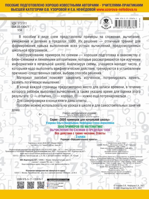 В пособии в виде схем представлены примеры на сложение, вычитание, умножение и деление в пределах 1000. Их решение - отличный тренинг для формирования навыка выполнения всех устных вычислений, предусмотренных школьной программой.