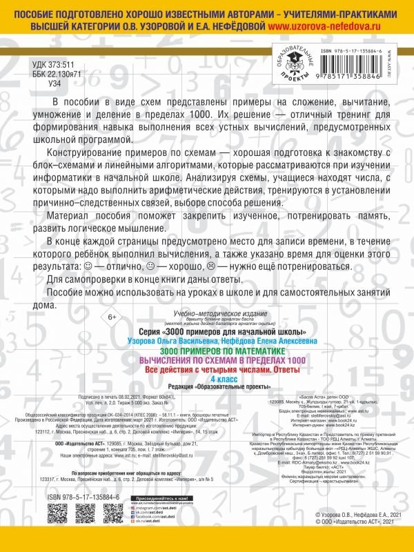 В пособии в виде схем представлены примеры на сложение, вычитание, умножение и деление в пределах 1000. Их решение - отличный тренинг для формирования навыка выполнения всех устных вычислений, предусмотренных школьной программой.