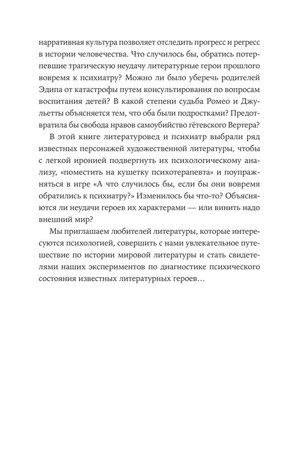 Что, если бы литературные герои прошлого и настоящего, потерпевшие трагическую неудачу, обратились вовремя к психотерапевту? Уберегла бы родителей царя Эдипа от катастрофы консультация по вопросам воспитания детей? Развернулась бы иначе история Ромео и Джульетты, если бы они были старше? Может, Дракулу не понимали окружающие, а Волан-де-Морта недолюбили в детстве? Означают ли эротические фантазии Кристиана Грея из «Пятидесяти оттенков серого» нехватку в нем мужественности?