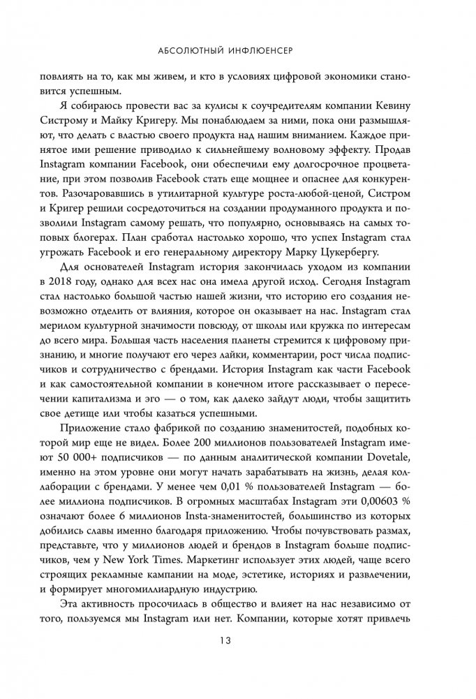 Отмеченная наградами журналистка Bloomberg Сара Фрайер представляет правдивую историю одного из самых популярных и дорогих приложений планеты — Instagram. Фрайер вскрывает механизмы, которые привели приложение к сокрушительному успеху, а также анализирует, как оно изменило мир, культуру, бизнес и человеческие отношения. Вас ждут откровенные интервью с основателями, сотрудниками и конкурентами Instagram, главным редактором Vogue Анной Винтур, Крис Дженнер. Вы узнаете, к чему может привести борьба идеалистов с коммерциализацией, и как Instagram стал мерилом культурной значимости и линзой нашего общества.