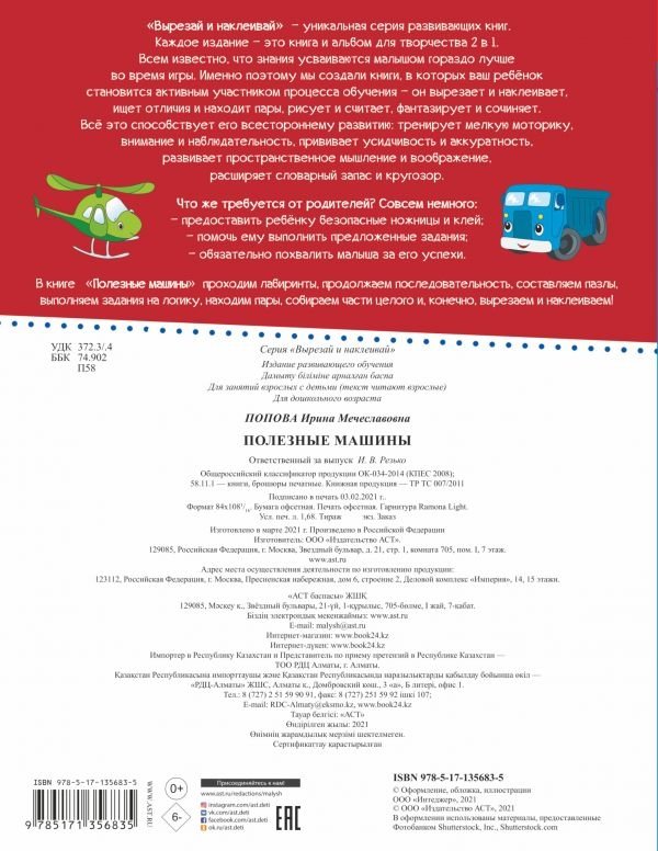 В книге "Полезные машины" проходим лабиринты, продолжаем последовательность, составляем пазлы, выполняем задания на логику, находим пары, собираем части целого и, конечно, вырезаем и наклеиваем!