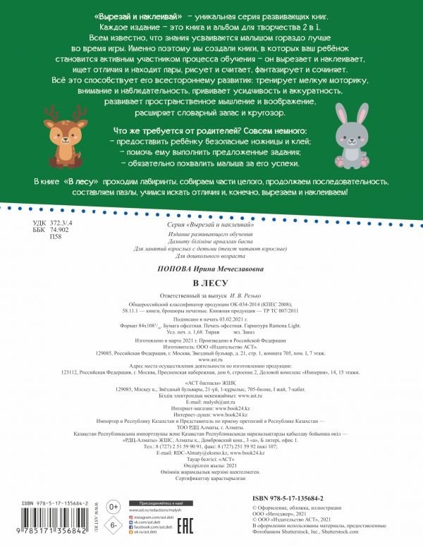 В книге "В лесу" проходим лабиринты, собираем части целого, продолжаем последовательность, составляем пазлы, учимся искать отличия и, конечно, вырезаем и наклеиваем!
