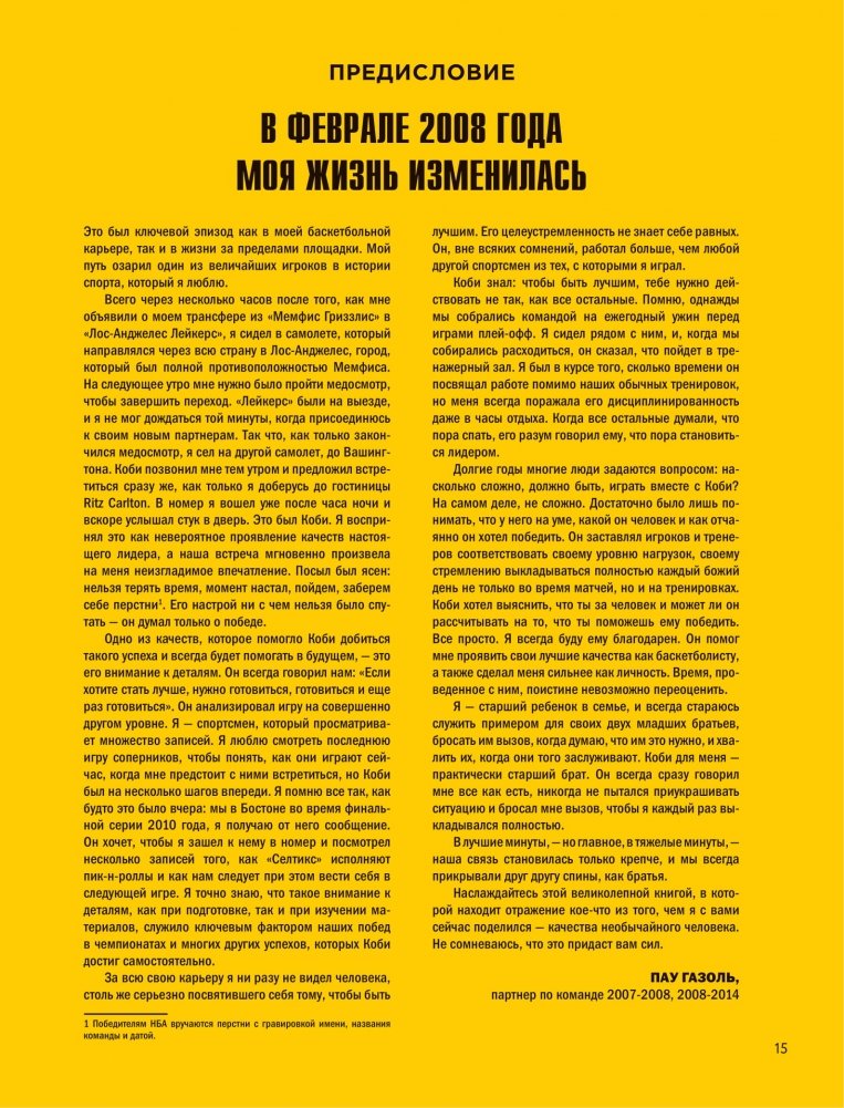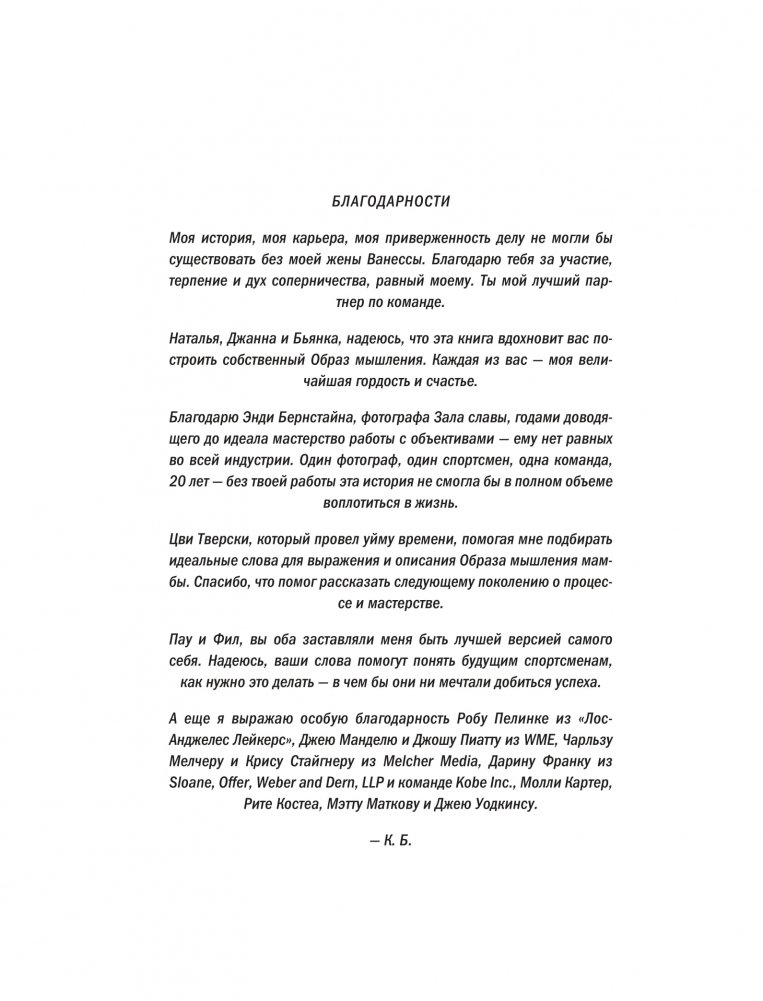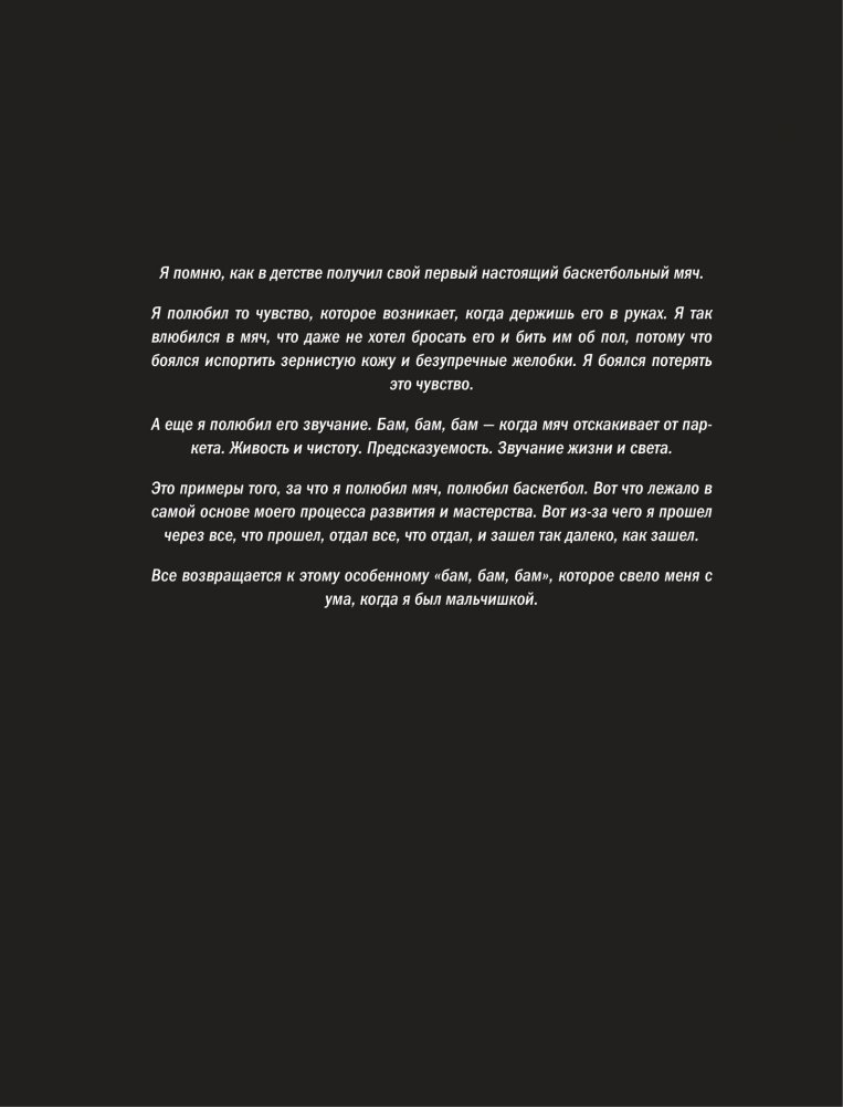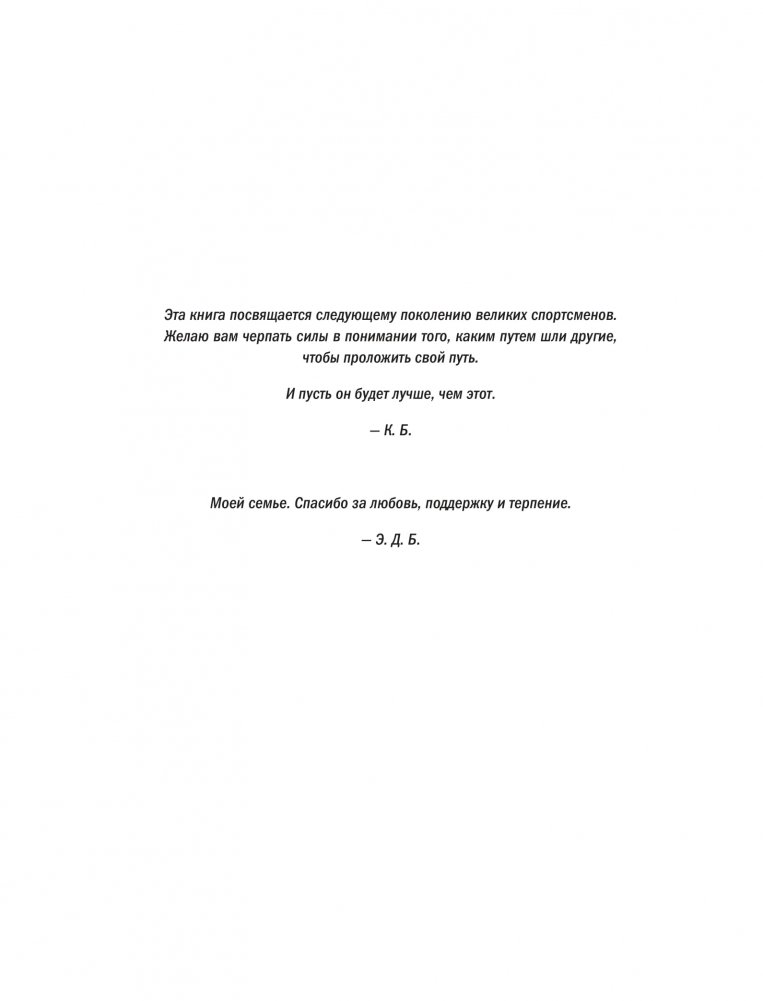 Пятикратный чемпион НБА, двукратный олимпийский чемпион в составе сборной США, многократный участник Матча всех звёзд НБА и обладатель кинопремии "Оскар". Коби Брайант – легенда американского и мирового баскетбола. Невероятное трудолюбие, стремление быть лидером на паркете каждую секунду времени, пристальное внимание к деталям – качества, характеризующие личность Черной Мамбы. Коби предлагает читателю заглянуть за кулисы лучшей лиги мира, делится особенностями тренировочного процесса, рассказывает о самых тяжелых моментах своей карьеры, когда от него требовалось проявить несгибаемую силу воли. Эта книга – исповедь человека, в груди которого бьётся хладнокровное сердце настоящего чемпиона, стремящегося быть лучшим каждый момент своей жизни.